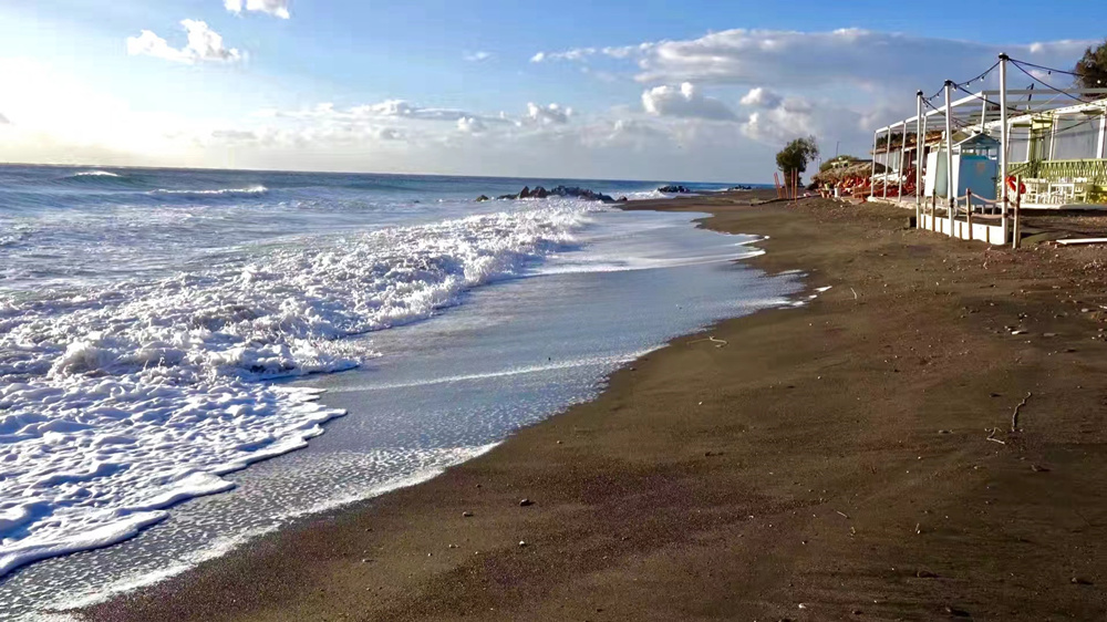 黑沙灘是圣托里尼有名的礦物沙灘,在旅游旺季時(shí)游人非常多。這里的沙灘其實(shí)是火山噴發(fā)后的火山灰沉積下來(lái)的小沙石,經(jīng)過(guò)長(zhǎng)期的風(fēng)化形成了如今的黑沙灘。李仁奇 攝