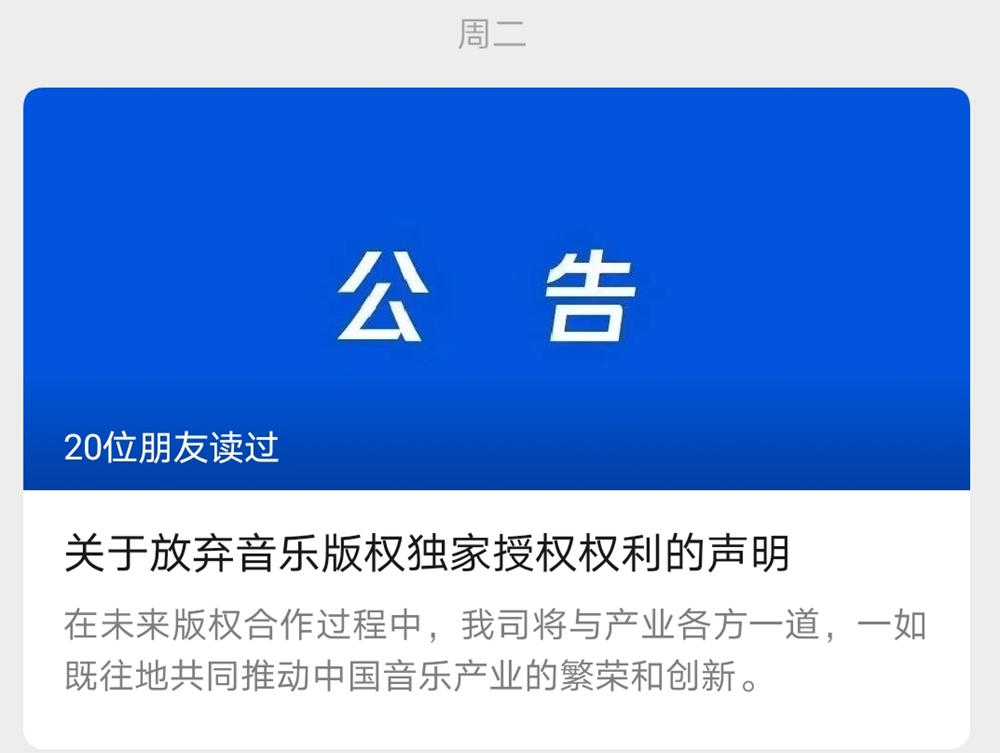 (相關(guān)報(bào)道:發(fā)聲明放棄音樂版權(quán)獨(dú)家授權(quán),騰訊為啥這樣做)