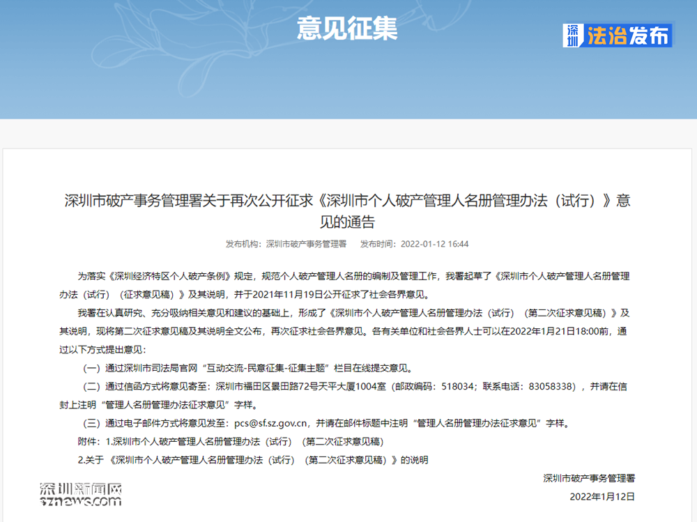 在認真研究、充分吸納相關意見和建議的基礎上,深圳市破產(chǎn)事務管理署形成了《深圳市個人破產(chǎn)管理人名冊管理辦法(試行)(第二次征求意見稿)》及其說明,已將第二次征求意見稿及其說明全文在深圳市司法局官網(wǎng)公布,各有關單位和社會各界人士可以在2022年1月21日18:00前,通過以下方式提出意見: