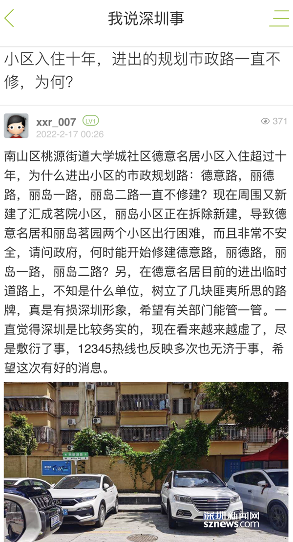 讀特客戶端·深圳新聞網(wǎng)2022年2月18日訊(記者 馮牧原 實(shí)習(xí)生 彭軼群)近日,有網(wǎng)友在深圳新聞網(wǎng)深圳論壇上報(bào)料稱,南山區(qū)桃源街道德意名居小區(qū)入住已超過(guò)10年,但進(jìn)出小區(qū)的市政規(guī)劃路長(zhǎng)期未修建,導(dǎo)致居住在附近小區(qū)的居民出行困難,車輛違停占用消防通道也存在安全隱患。