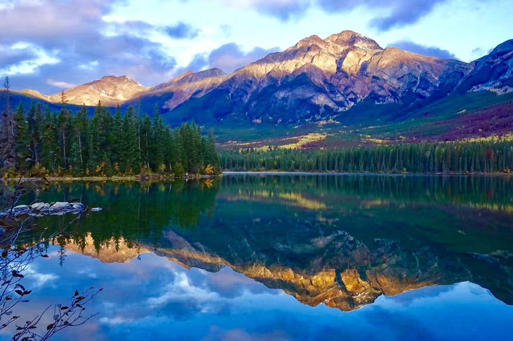 賈斯帕鎮(zhèn)北邊約7公里處的金字塔湖,海拔1179米,湖邊一座海拔2763米的山峰,呈比較對(duì)稱(chēng)的三角形,山上的巖石含有黃鐵礦,呈現(xiàn)出被風(fēng)化了的粉色和橘色,像鍍了一層金,金字塔山和金字塔湖由此得名。李仁奇 攝