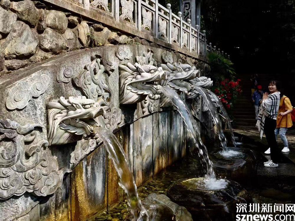 景區(qū)在蝴蝶泉出水口處修葺了五龍池,五股清泉從龍頭噴涌而下,形成一個五龍吐水、浪花飛濺的景觀。李仁奇 攝