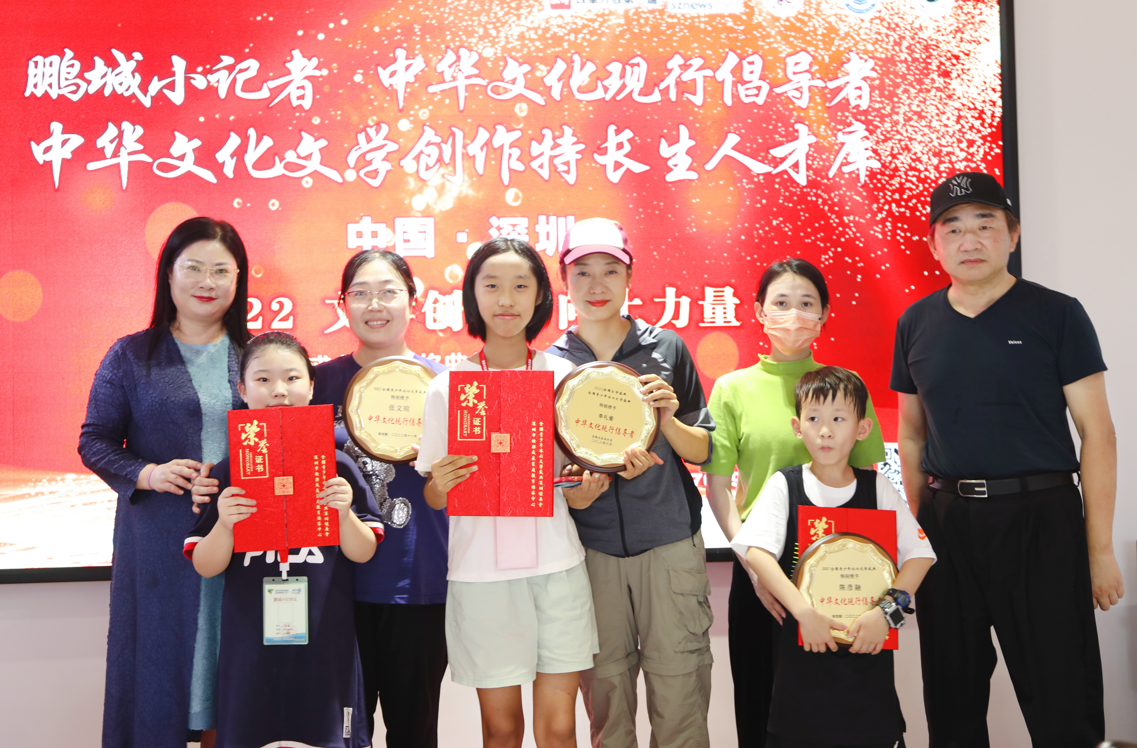 “中華文化現(xiàn)行倡導者”“中華文化文學特長生人才庫”和“鵬城小記者”的優(yōu)生代表們與家長、頒獎嘉賓合影留念