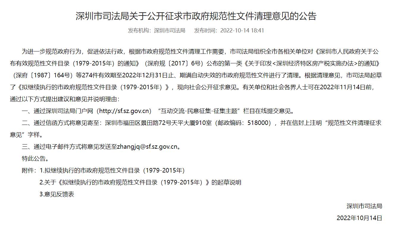 讀特客戶端·深圳新聞網(wǎng)2022年10月20日訊(記者 翁任瑩)近日,深圳市司法局就《擬繼續(xù)執(zhí)行的市政府規(guī)范性文件目錄(1979-2015年)》向社會(huì)公開(kāi)征求意見(jiàn),擬對(duì)274件有效期至2022年12月31日止、期滿自動(dòng)失效的市政府規(guī)范性文件進(jìn)行清理。