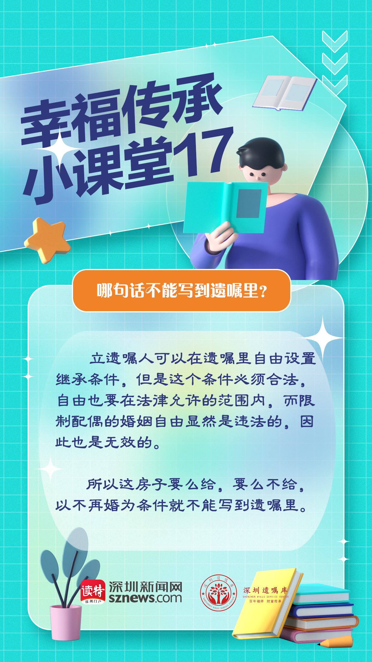 由深圳新聞網(wǎng)聯(lián)合廣東嘉得信律師事務所、深圳遺囑庫特別策劃的“幸福傳承小課堂”第17期就來說說,哪些話不能寫到遺囑里。上述案例的老兩口考慮很周全,他們把各個銀行的存款都列了一個明細單,標明了分配方式,哪一筆給兒子,哪一筆留給女兒,總體來說兒女分到的財產(chǎn)都差不多。
