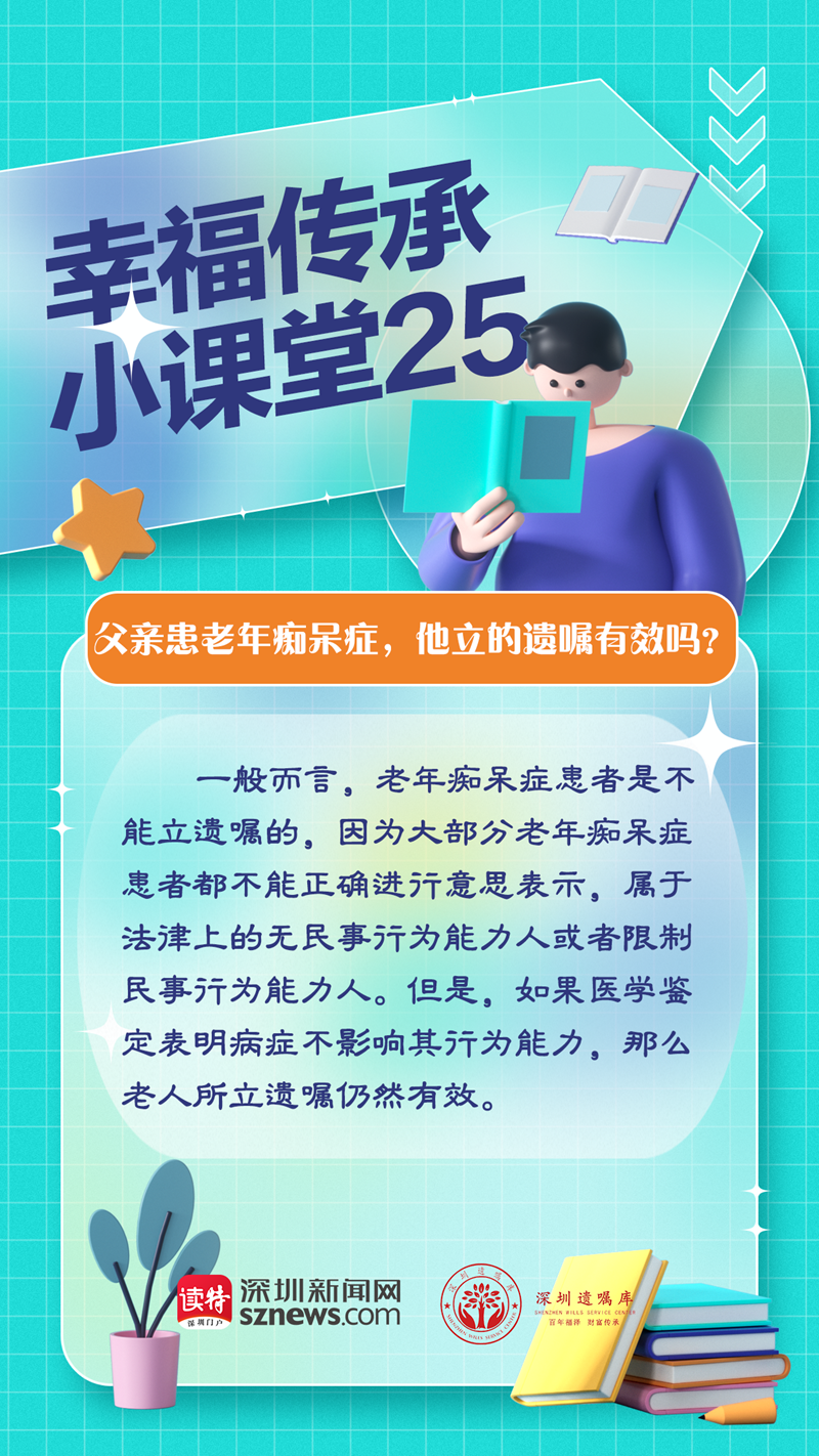 讀特客戶端·深圳新聞網2023年2月8日訊(記者 翁任瑩 張玲)李女士照顧患了老年癡呆癥的父親六年,父親去世后,李女士三個哥哥要求與妹妹平分父親的遺產。女兒拿出了一份父親的遺囑,哥哥們卻認為這份遺囑無效。由廣東嘉得信律師事務所和深圳新聞網聯合開設的“幸福傳承小課堂”開講第25期,我們來聊聊上述情形的遺囑效力。