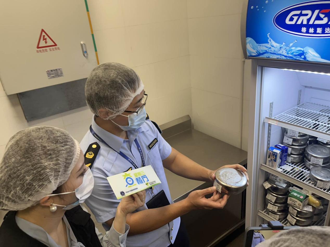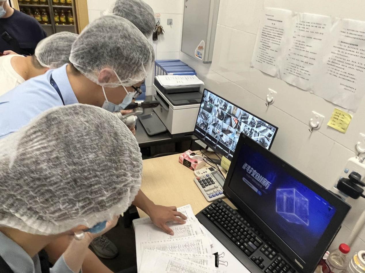 隨后,執(zhí)法人員一行進入食堂后廚,對面點間、儲藏間、清洗區(qū)、冷凍庫等各分區(qū)進行執(zhí)法檢查。經(jīng)查,后廚整體布局合理,其中食材存儲符合規(guī)定且日期均在保質期內(nèi);留樣冰箱內(nèi)按規(guī)定保存了近期餐食樣品,留樣品名及時間標注清晰,確保了來源可追溯;清洗區(qū)分區(qū)明確,刀具砧板按照顏色管理,有效避免了交叉感染。此外,在后廚辦公室,執(zhí)法人員查看了索證索票落實情況及日管控、周排查、月調(diào)度等相關制度管理資料,各類信息管理較完善。