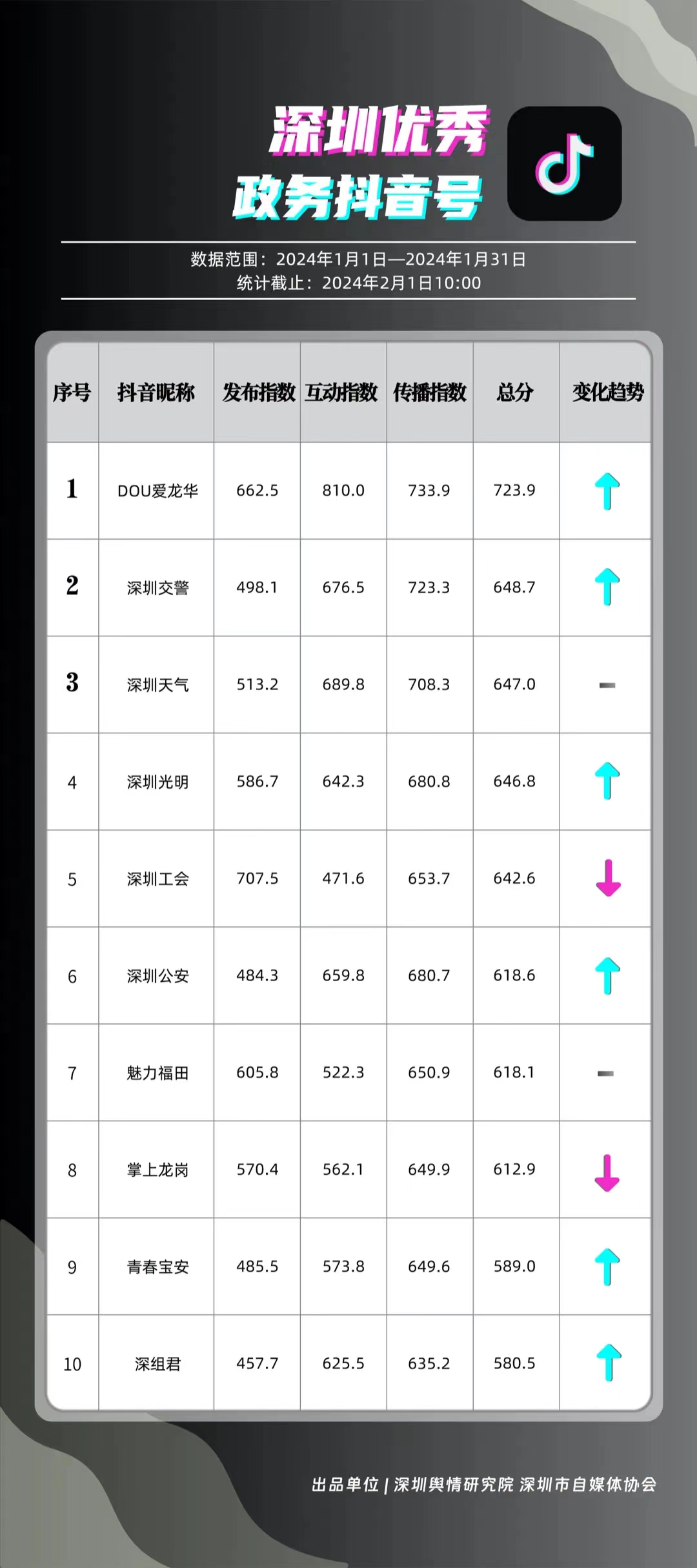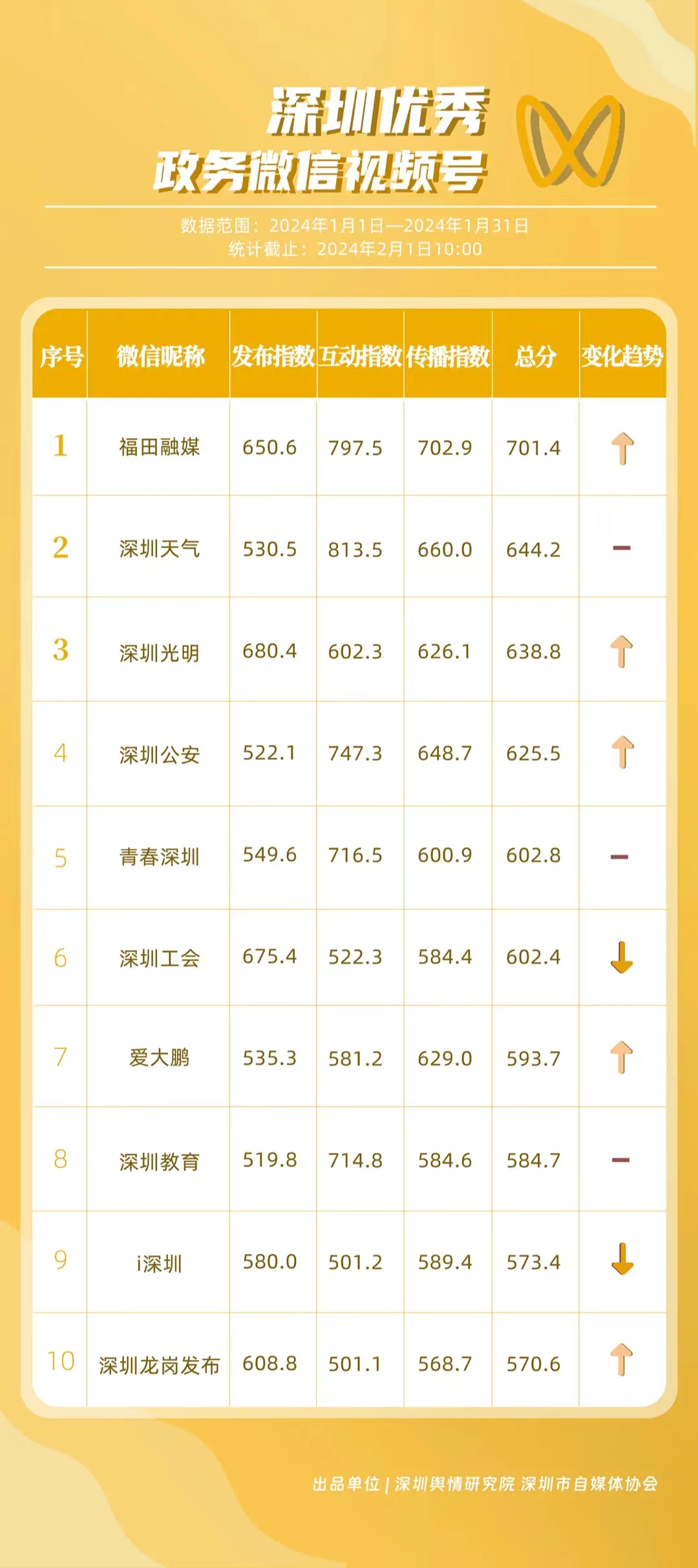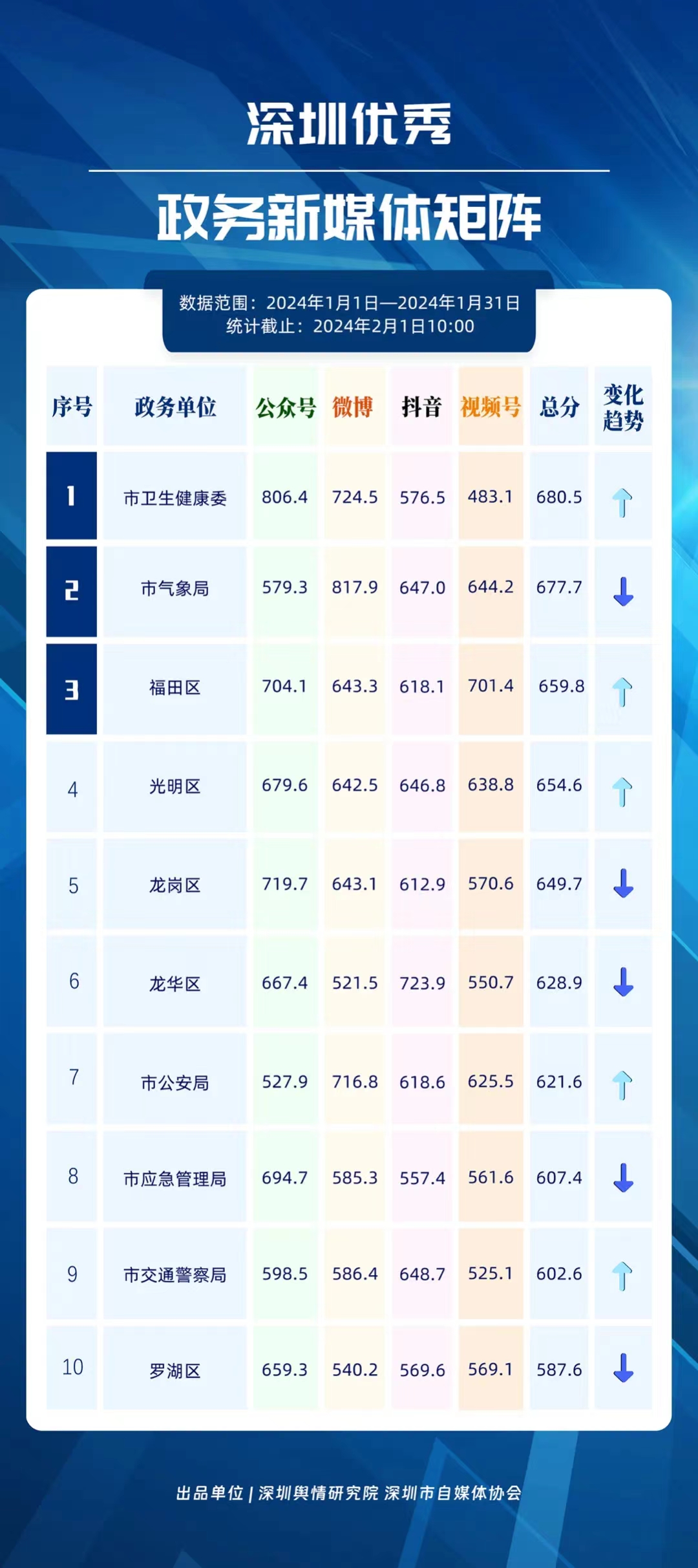 深圳新聞網(wǎng)2月9日訊(記者 陳曉君 實習生 張馳)2月8日,深圳輿情研究院、深圳市自媒體協(xié)會聯(lián)合推出《深圳優(yōu)秀政務(wù)新媒體矩陣》(2024年1月期),市衛(wèi)生健康委、市氣象局、福田區(qū)、光明區(qū)、龍崗區(qū)、龍華區(qū)、市公安局、市應(yīng)急管理局、市交通警察局、羅湖區(qū)的新媒體矩陣獲評“深圳優(yōu)秀政務(wù)新媒體矩陣”。這些矩陣在內(nèi)容發(fā)布、受眾互動和信息傳播方面取得了較好成績,并在深圳政務(wù)新媒體規(guī)范有序發(fā)展進程中發(fā)揮著積極作用。