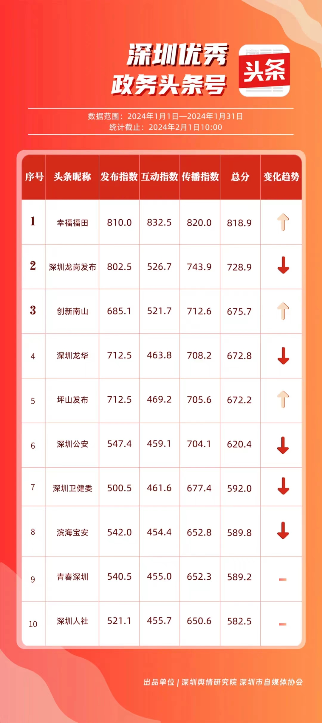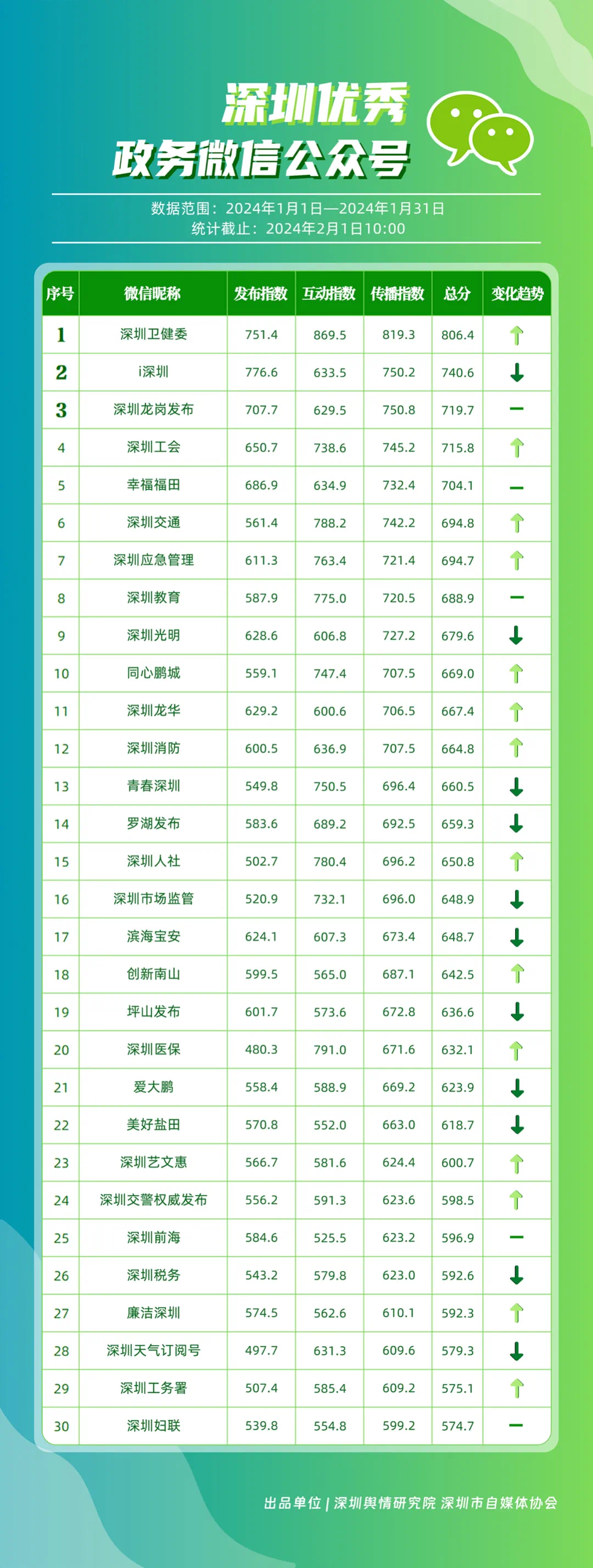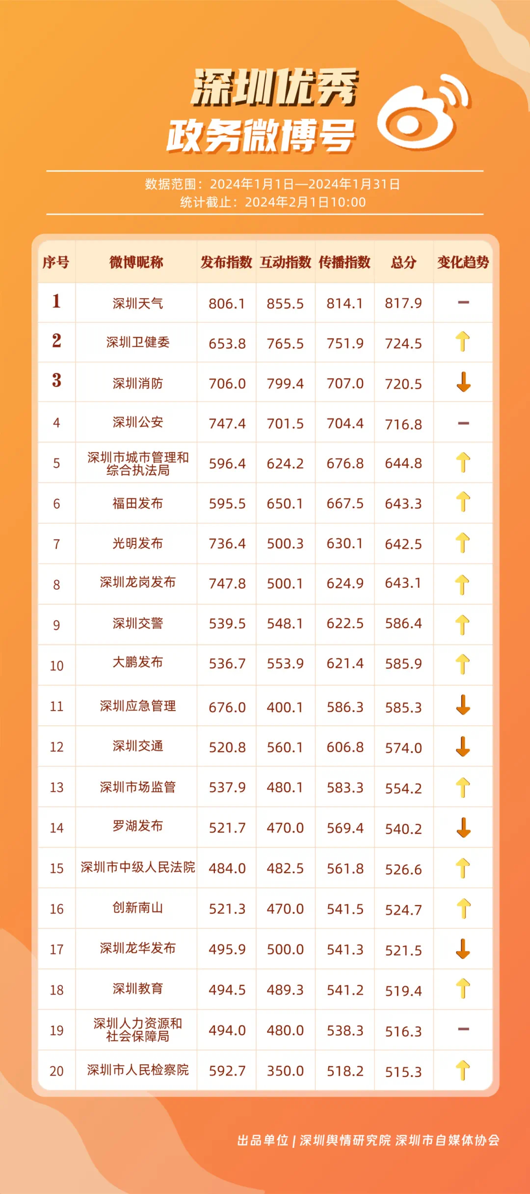 深圳新聞網(wǎng)2月9日訊(記者 陳曉君 實習生 張馳)2月8日,深圳輿情研究院、深圳市自媒體協(xié)會聯(lián)合推出《深圳優(yōu)秀政務(wù)新媒體矩陣》(2024年1月期),市衛(wèi)生健康委、市氣象局、福田區(qū)、光明區(qū)、龍崗區(qū)、龍華區(qū)、市公安局、市應(yīng)急管理局、市交通警察局、羅湖區(qū)的新媒體矩陣獲評“深圳優(yōu)秀政務(wù)新媒體矩陣”。這些矩陣在內(nèi)容發(fā)布、受眾互動和信息傳播方面取得了較好成績,并在深圳政務(wù)新媒體規(guī)范有序發(fā)展進程中發(fā)揮著積極作用。