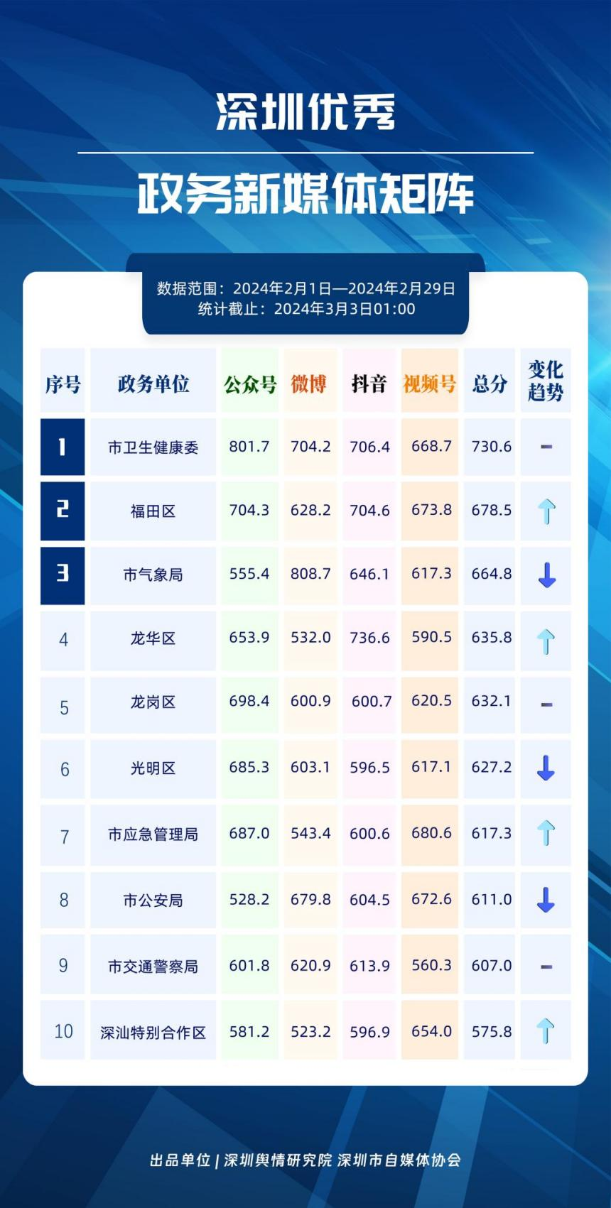 記者關(guān)注到,2月深圳優(yōu)秀政務(wù)新媒體矩陣共10個(gè),展現(xiàn)出多單位在鍛造政務(wù)新媒體優(yōu)質(zhì)矩陣方面取得的良好成效,助力深圳政務(wù)新媒體矩陣健康有序發(fā)展。