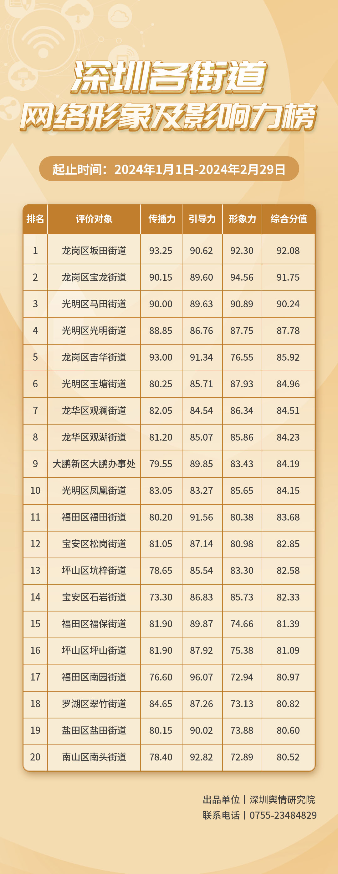 2024年3月,深圳市各街道展現(xiàn)出蓬勃的發(fā)展活力,努力塑造良好的網(wǎng)絡(luò)形象。讓我們共同關(guān)注《深圳各街道網(wǎng)絡(luò)形象及影響力榜》(2024年3月榜單)。本期榜單數(shù)據(jù)統(tǒng)計(jì)范圍為2024年3月1日至3月31日。