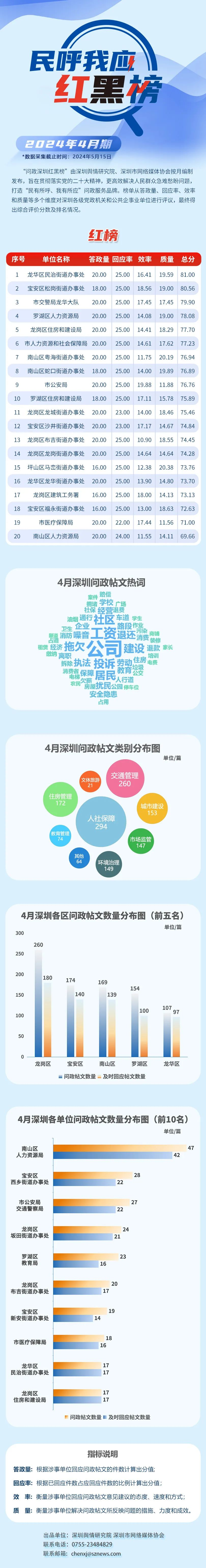 “深圳民呼我應(yīng)紅黑榜”由深圳輿情研究院、深圳市網(wǎng)絡(luò)媒體協(xié)會按月編制發(fā)布,旨在貫徹落實黨的二十大精神,更高效解決人民群眾急難愁盼問題,打造“民有所呼、我有所應(yīng)”問政服務(wù)品牌。榜單從答政量、回應(yīng)率、效率和質(zhì)量等多個維度對深圳各級黨政機關(guān)和公共企事業(yè)單位進行評議,最終得出綜合評價分?jǐn)?shù)及排名情況。
