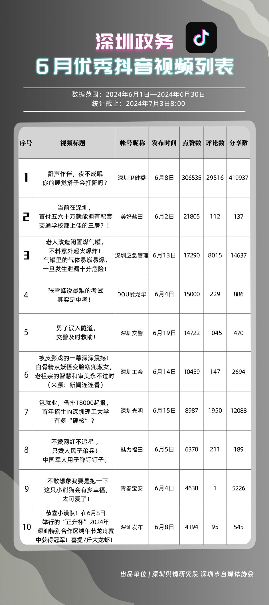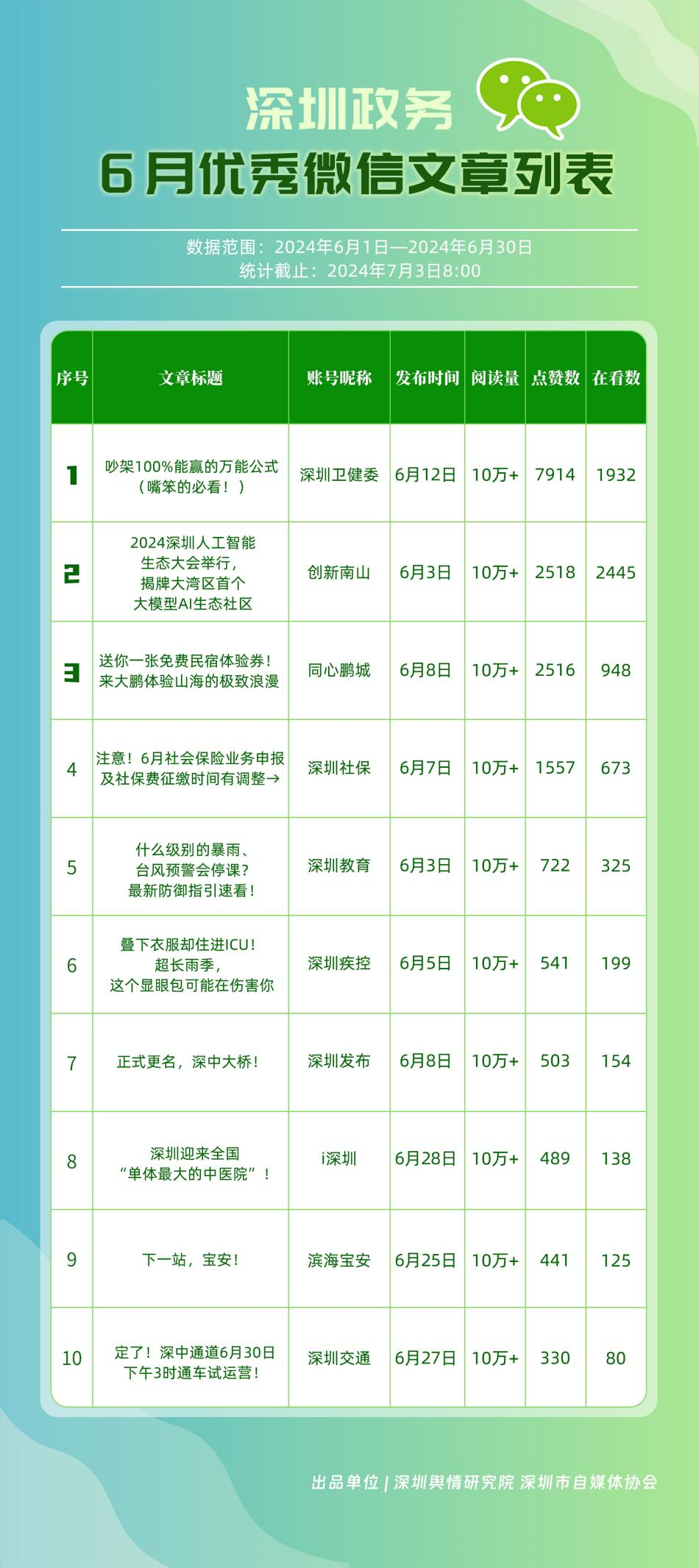6月,“深圳衛(wèi)健委”“i深圳”“深圳龍崗發(fā)布”“幸福福田”“深圳交通”“深圳教育”“濱海寶安”“創(chuàng)新南山”“深圳工會(huì)”“青春深圳”“同心鵬城”“深圳光明”等30個(gè)政務(wù)微信公眾號(hào),被評(píng)為“深圳優(yōu)秀政務(wù)微信公眾號(hào)”。6月,“深圳衛(wèi)健委”因內(nèi)容策劃出色、受眾互動(dòng)活躍、作品火熱“出圈”等,榮登排行榜首位?!皠?chuàng)新南山”“同心鵬城”“深圳社?!薄吧钲诮逃钡壬习窆娞?hào)也積極創(chuàng)作優(yōu)質(zhì)作品,抓住時(shí)下熱點(diǎn)趨勢(shì),集中發(fā)揮政務(wù)媒體傳播力量,推動(dòng)了政務(wù)信息傳播工作提質(zhì)增效。
