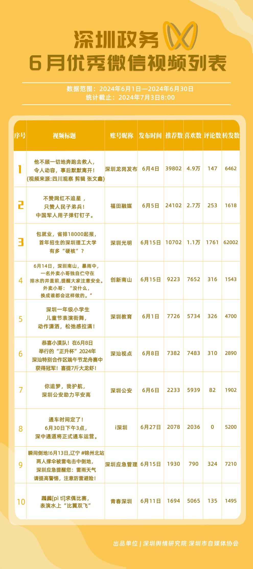 6月,政務(wù)微信視頻號(hào)“深圳光明”“福田融媒”“創(chuàng)新南山”“深圳教育”“深圳龍崗發(fā)布”“深汕觀點(diǎn)”“深圳工會(huì)”“深圳公安”“深圳應(yīng)急管理”和“青春深圳”榮獲“深圳優(yōu)秀政務(wù)微信視頻號(hào)”稱號(hào)。結(jié)合整體數(shù)據(jù)來看,6月深圳政務(wù)視頻號(hào)平臺(tái)推出多條爆款視頻,如《他不顧一切地奔跑去救人,令人動(dòng)容,事后默默離開!》《不贊網(wǎng)紅不追星,只贊人民子弟兵!中國軍人用子彈釘釘子》等作品,收獲了上萬的推薦數(shù)和喜歡數(shù),是政務(wù)信息傳播高效化和正能量傳播機(jī)制的體現(xiàn)。