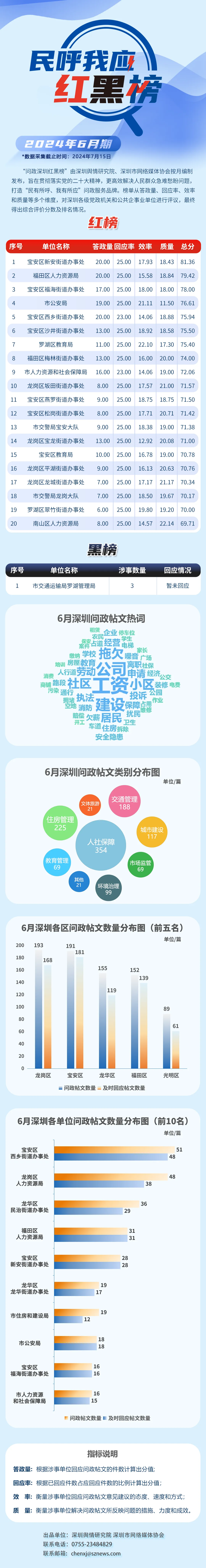 2024年6月,共有20家單位因積極解決民生問題,認真細致答政,登上“紅榜”,它們分別是:寶安區(qū)新安街道辦事處、福田區(qū)人力資源局、寶安區(qū)福海街道辦事處、市公安局、寶安區(qū)西鄉(xiāng)街道辦事處、寶安區(qū)沙井街道辦事處、羅湖區(qū)教育局、福田區(qū)梅林街道辦事處、市人力資源和社會保障局、龍崗區(qū)坂田街道辦事處、寶安區(qū)燕羅街道辦事處、寶安區(qū)松崗街道辦事處、市交警局寶安大隊、龍崗區(qū)寶龍街道辦事處、寶安區(qū)教育局、龍崗區(qū)平湖街道辦事處、龍崗區(qū)龍城街道辦事處、市交警局龍崗大隊、羅湖區(qū)翠竹街道辦事處、南山區(qū)人力資源局。另外,市交通運輸局羅湖管理局因相關(guān)帖文回應率偏低,整體答政效果不佳,被列入“黑榜”。