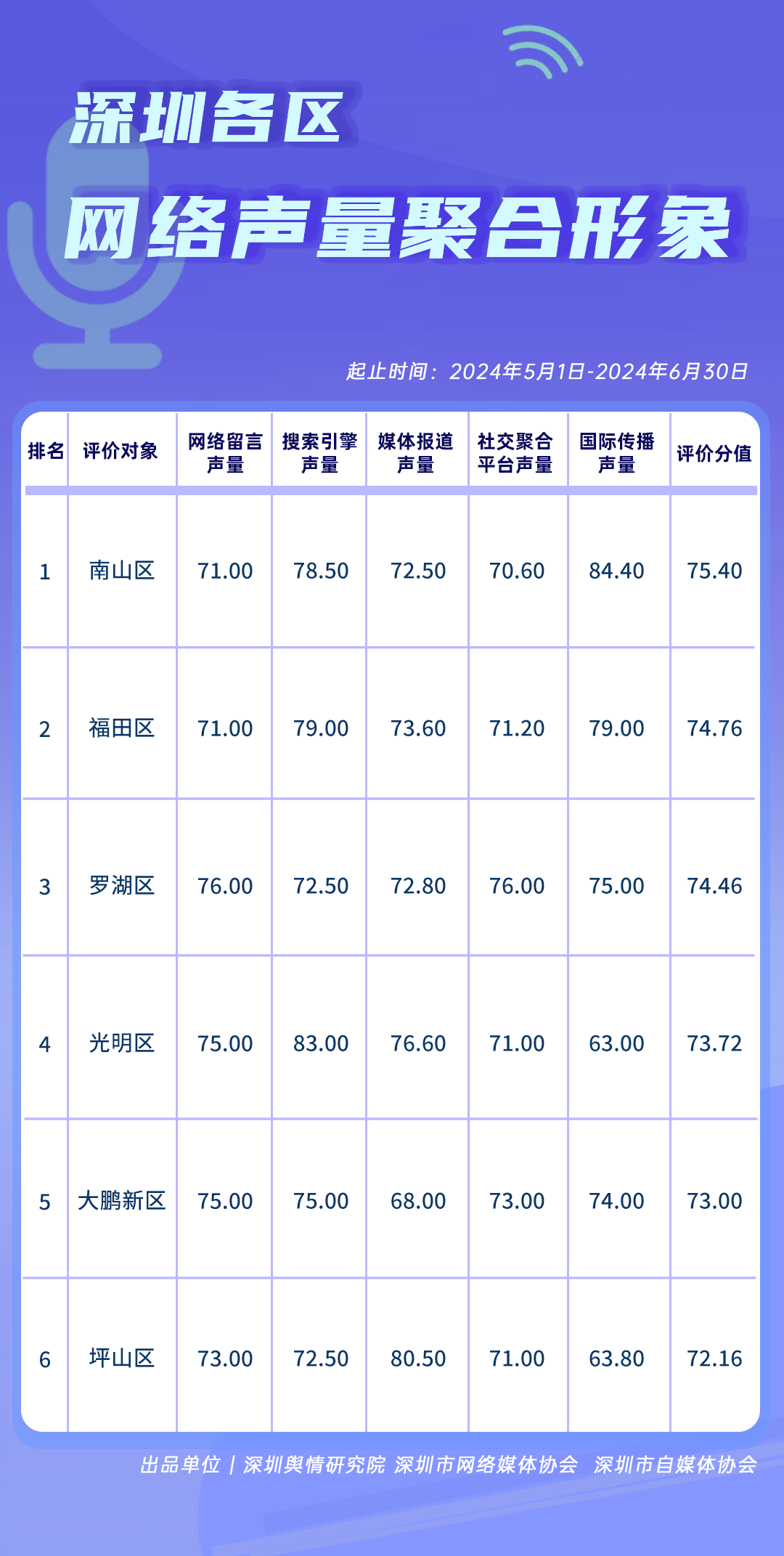 5-6月,進(jìn)入《深圳各區(qū)網(wǎng)絡(luò)聲量聚合形象榜》前三名的是南山區(qū)、福田區(qū)、羅湖區(qū)。其中,南山區(qū)在多區(qū)中脫穎而出,評(píng)價(jià)分值為75.40分,搜索引擎聲量、國(guó)際傳播聲量?jī)蓚€(gè)指標(biāo)的評(píng)價(jià)分值較高,反映出境內(nèi)外網(wǎng)民對(duì)南山區(qū)的較高關(guān)注度。福田區(qū)、羅湖區(qū)緊跟其后,位于第二、第三名,得分均在74分以上,彰顯出兩區(qū)在區(qū)域形象塑造方面優(yōu)秀的綜合實(shí)力。另外,位于第四至第六名的是光明區(qū)、大鵬新區(qū)、坪山區(qū),同樣贏得了公眾的廣泛認(rèn)可,若能夠持續(xù)加力,保持進(jìn)取態(tài)勢(shì),未來(lái)必將展現(xiàn)更加卓越的風(fēng)采。