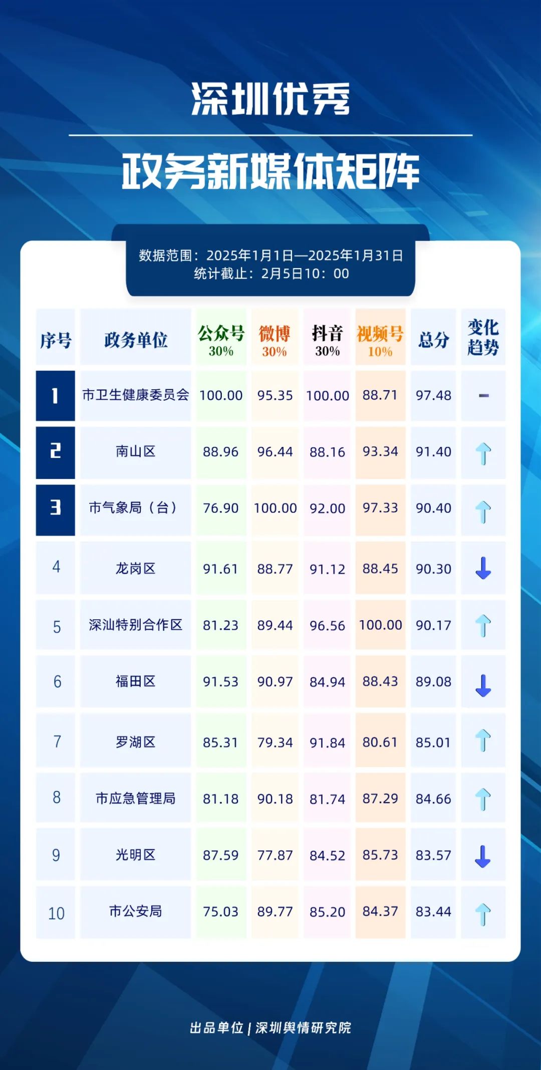 2025年1月期《深圳優(yōu)秀政務新媒體矩陣》發(fā)布,一同揭曉哪些政務新媒體矩陣能夠憑借其卓越表現(xiàn)脫穎而出,成為推動政務信息傳播與服務模式創(chuàng)新的領航者,引領政務新媒體運營邁向新高度。