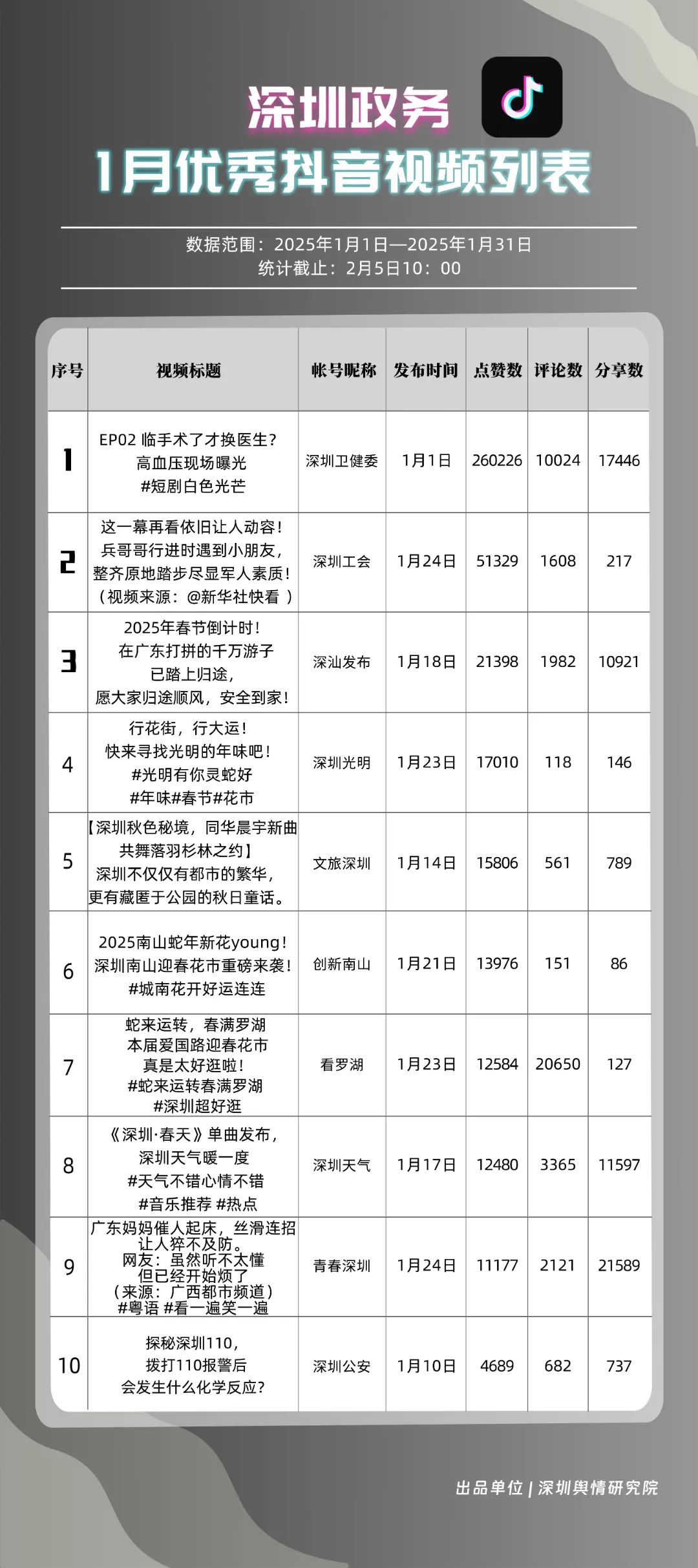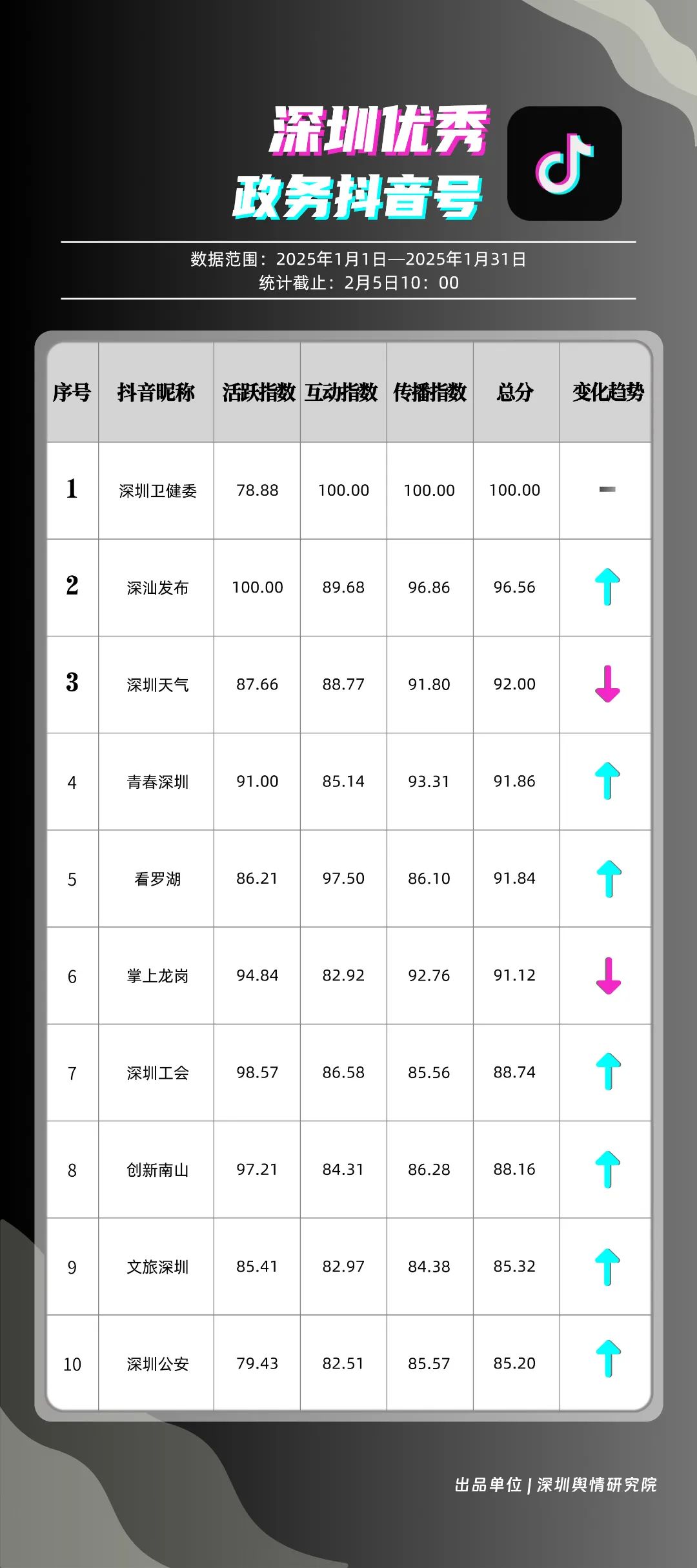 1月,“深圳衛(wèi)健委”“深汕發(fā)布”“深圳天氣”“青春深圳”“看羅湖”“掌上龍崗”“深圳工會”“創(chuàng)新南山”“文旅深圳”“深圳公安”共10個政務抖音號獲得“深圳優(yōu)秀政務抖音號”稱號?!吧钲谛l(wèi)健委”“深汕發(fā)布”“深圳天氣”成績優(yōu)異,綜合實力較強,位于榜單前列?!扒啻荷钲凇薄翱戳_湖”等賬號排名有所提升,彰顯了這些賬號在拓寬受眾基礎、增強用戶黏性等方面所取得的積極成效。