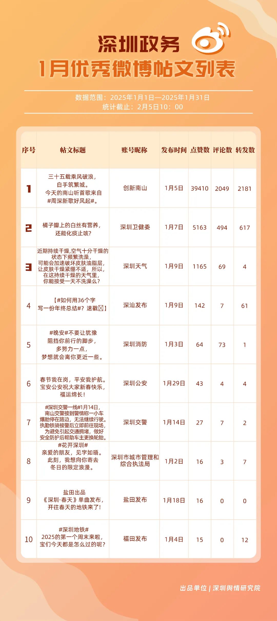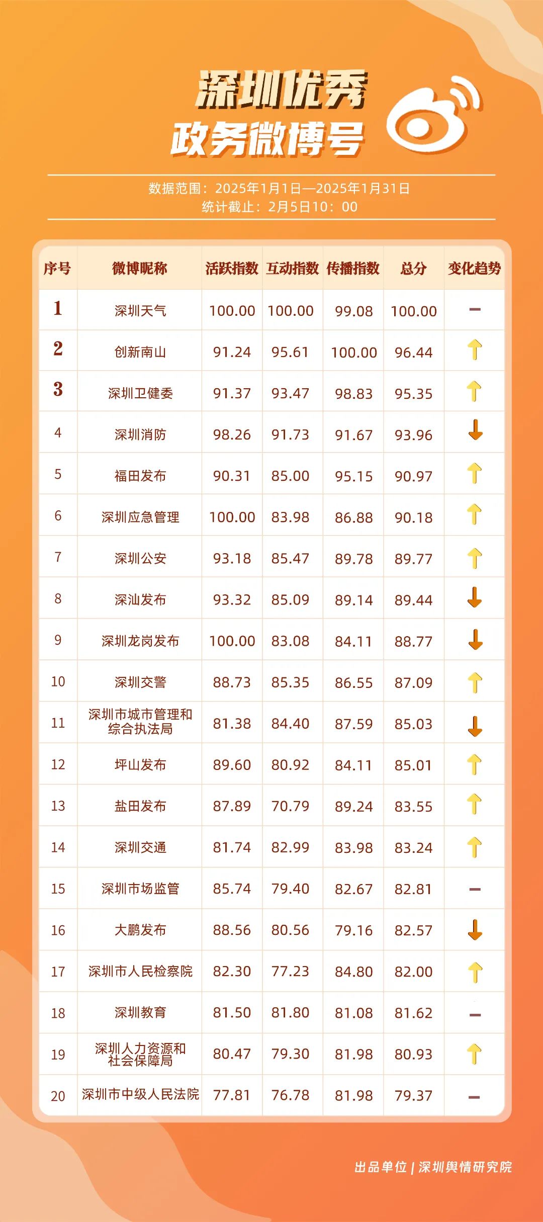 1月,“深圳天氣”“創(chuàng)新南山”“深圳衛(wèi)健委”“深圳消防”“福田發(fā)布”“深圳應急管理”“深圳公安”“深汕發(fā)布”“深圳龍崗發(fā)布”“深圳交警”等20個賬號入選“優(yōu)秀政務微博號”?!吧钲谔鞖狻睉{借高活躍度、互動量等獲得滿分,“創(chuàng)新南山”“深圳衛(wèi)健委”賬號則在1月發(fā)力宣傳,排名上升至榜單第二、三位。同時,“深圳消防”“福田發(fā)布”“深圳應急管理”賬號總分在90分以上,彰顯了他們在提升公眾安全意識、促進政民互動等方面所做出的積極貢獻。