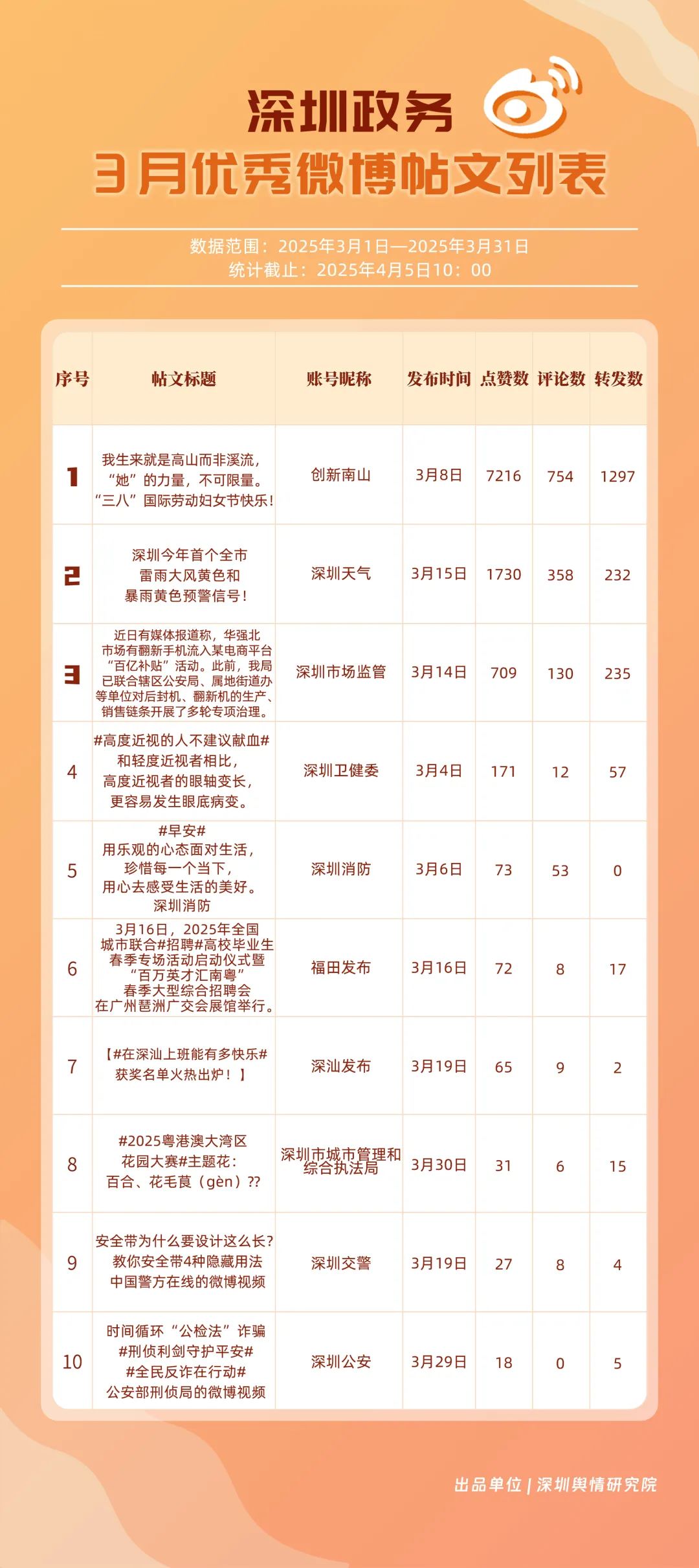3月,“深圳天氣”“創(chuàng)新南山”“深圳衛(wèi)健委”“深圳消防”“福田發(fā)布”“深圳應(yīng)急管理”“深圳公安”“深圳市場(chǎng)監(jiān)管”“深圳龍崗發(fā)布”“深圳市城市管理和綜合執(zhí)法局”等20個(gè)賬號(hào)入選“優(yōu)秀政務(wù)微博號(hào)”。值得一提的是,“深圳天氣”賬號(hào)在3月共獲得點(diǎn)贊超11萬(wàn),相較其他賬號(hào)具備顯著優(yōu)勢(shì)。“創(chuàng)新南山”“深圳衛(wèi)健委”“深圳消防”也位列前茅,分差微小,競(jìng)爭(zhēng)激烈。從領(lǐng)域分布來(lái)看,上榜賬號(hào)不僅包括區(qū)級(jí)賬號(hào),還涵蓋民生服務(wù)、應(yīng)急科普、城市治理等單位賬號(hào),體現(xiàn)了深圳政務(wù)新媒體在多領(lǐng)域的強(qiáng)大影響力。