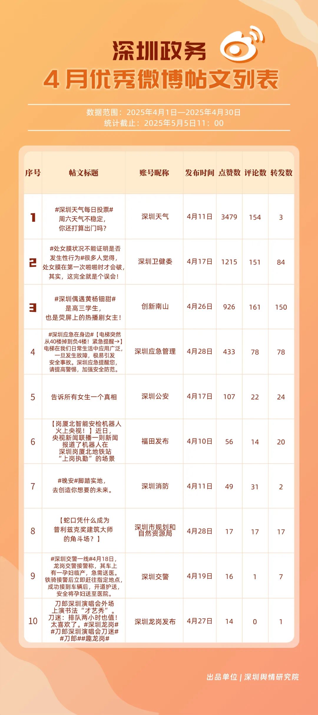 4月,“深圳天氣”“深圳衛(wèi)健委”“深圳消防”“深圳應(yīng)急管理”“創(chuàng)新南山”“深圳公安”“福田發(fā)布”“深圳龍崗發(fā)布”“深汕發(fā)布”“深圳交警”等20個(gè)賬號(hào)入選“優(yōu)秀政務(wù)微博號(hào)”。值得一提的是,“深圳天氣”在多個(gè)指標(biāo)中獲得滿分,其氣象信息的趣味性和實(shí)用性受到市民認(rèn)可;“深圳衛(wèi)健委”“深圳消防”“深圳應(yīng)急管理”也在信息傳播、互動(dòng)服務(wù)等方面持續(xù)發(fā)力,以超過(guò)90分的總分緊跟其后;“深汕發(fā)布”“深圳交警”相較于3月在榜單排名有所提升,展現(xiàn)出強(qiáng)勁的發(fā)展勢(shì)頭。這些優(yōu)秀政務(wù)微博號(hào)的脫穎而出,不僅體現(xiàn)了各自的運(yùn)營(yíng)實(shí)力,更反映出深圳政務(wù)新媒體在微博平臺(tái)的蓬勃發(fā)展態(tài)勢(shì)。