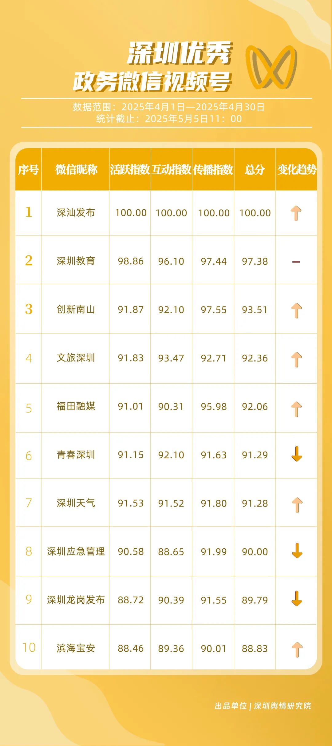 《深圳優(yōu)秀政務(wù)新媒體矩陣》將深圳黨政機(jī)關(guān)、企事業(yè)單位開(kāi)設(shè)的政務(wù)公眾號(hào)(微信)、微博號(hào)、抖音號(hào)、視頻號(hào)(微信)及頭條號(hào)按照活躍指數(shù)、互動(dòng)指數(shù)、傳播指數(shù)三項(xiàng)指標(biāo)進(jìn)行綜合評(píng)價(jià),最終形成優(yōu)秀名單。