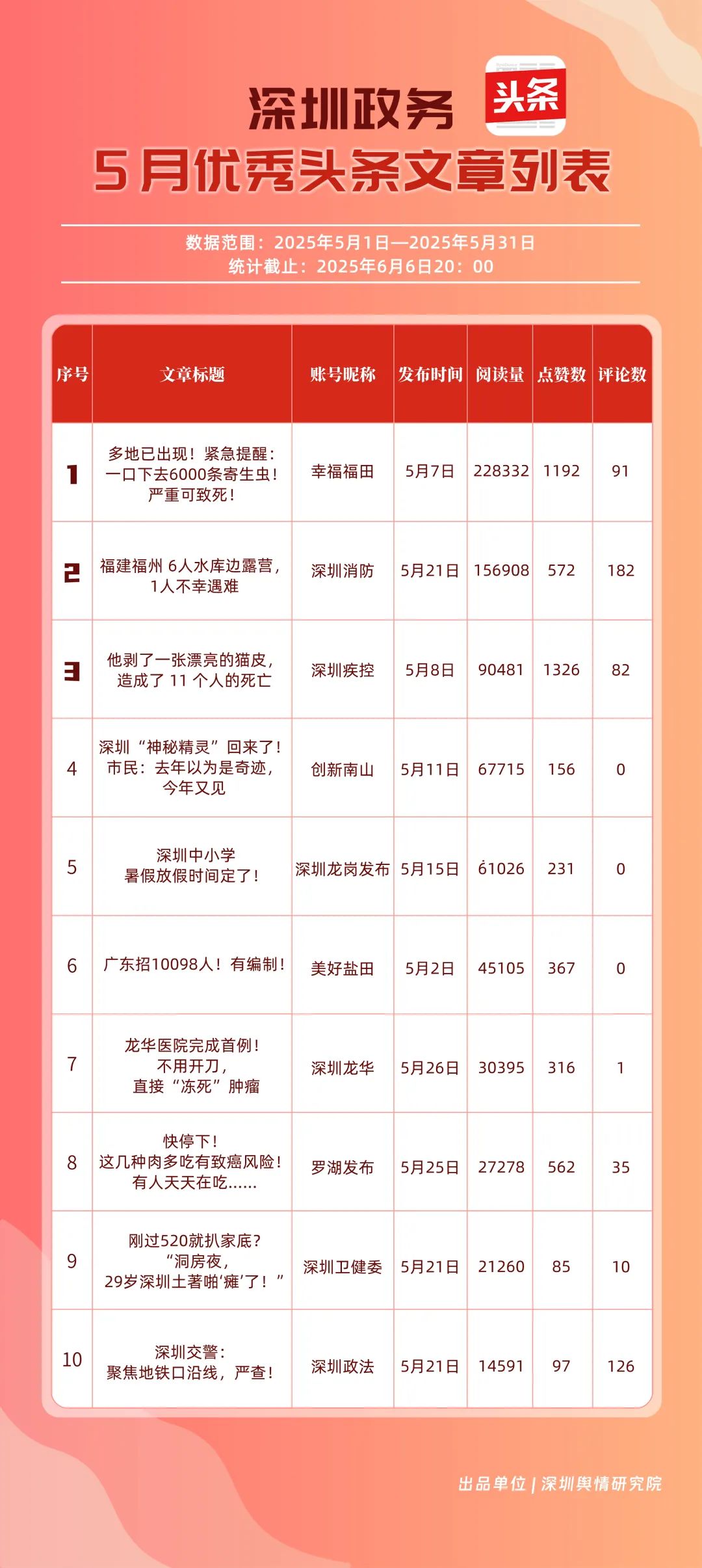 5月,“幸福福田”“深圳消防”“創(chuàng)新南山”“深圳疾控”“羅湖發(fā)布”“深圳龍崗發(fā)布”“坪山發(fā)布”“青春深圳”“深圳龍華”“深圳人社”共10個(gè)政務(wù)頭條號(hào)入選“優(yōu)秀政務(wù)頭條號(hào)”榜單。在榜單前三名中,“幸福福田”“創(chuàng)新南山”以穩(wěn)定且高質(zhì)量的內(nèi)容輸出,持續(xù)領(lǐng)跑,排名較上個(gè)月未發(fā)生變動(dòng)。位居榜單第二的“深圳消防”同樣表現(xiàn)亮眼,排名較上個(gè)月提升2個(gè)名次,充分展現(xiàn)了其在消防安全宣傳領(lǐng)域的持續(xù)深耕和創(chuàng)新突破。上榜政務(wù)頭條號(hào)各展所長,以優(yōu)質(zhì)內(nèi)容為核心,充分發(fā)揮平臺(tái)傳播優(yōu)勢(shì),為政務(wù)信息的高效觸達(dá)與廣泛傳播樹立了標(biāo)桿。
