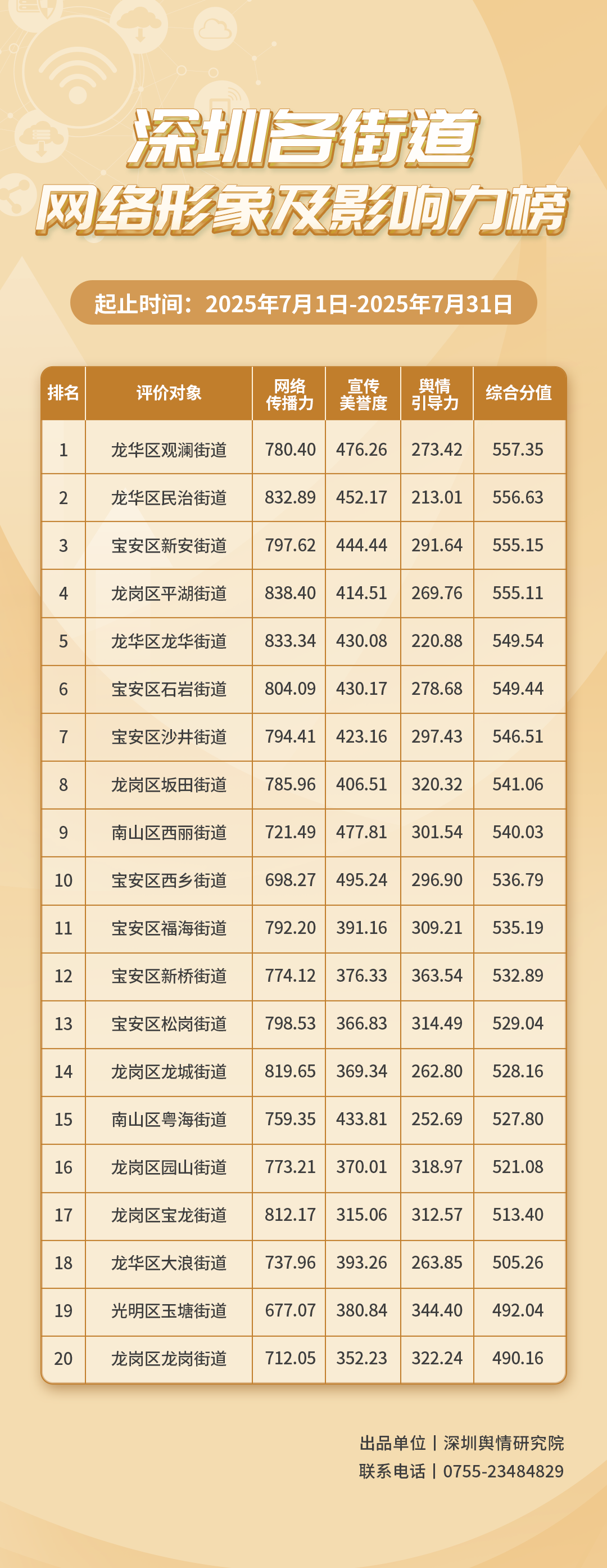7月,各街道主動挖掘社交平臺的傳播特點,完善基層治理模式。《深圳各街道網(wǎng)絡(luò)形象及影響力榜》(7月榜單)起,榜單各指標(biāo)占比優(yōu)化,在計算綜合分值時,將網(wǎng)絡(luò)傳播力、宣傳美譽(yù)度、輿情引導(dǎo)力三項指標(biāo)的占比,調(diào)整為40%、40%、20%,以便更好地觀察與評估各街道在網(wǎng)絡(luò)空間的展現(xiàn)及其影響力。本次榜單的數(shù)據(jù)統(tǒng)計時間跨度為2025年7月1日至7月31日。