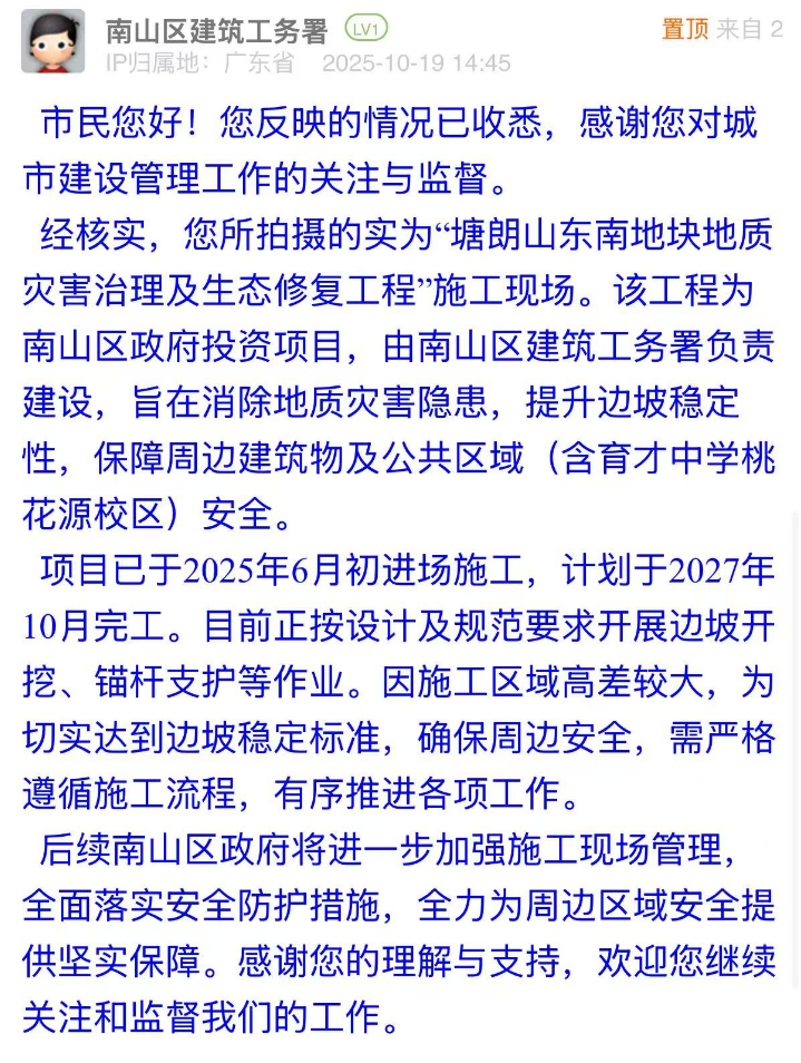 案例點(diǎn)評:針對市民疑慮,相關(guān)部門的回應(yīng)展現(xiàn)出“透明化+精細(xì)化”的治理思路:第一時間明確工程屬性并同步告知工期安排,主動消解市民對工程進(jìn)展的不確定性擔(dān)憂;同時,南山區(qū)建筑工務(wù)署還表示后續(xù)將進(jìn)一步加強(qiáng)現(xiàn)場管理,回應(yīng)關(guān)切。這種回應(yīng)思路既解決了市民的困惑,也通過可感知的舉措傳遞了對安全的重視態(tài)度,是城市工程類訴求處置中“信息公開”“風(fēng)險閉環(huán)”的有效示范。