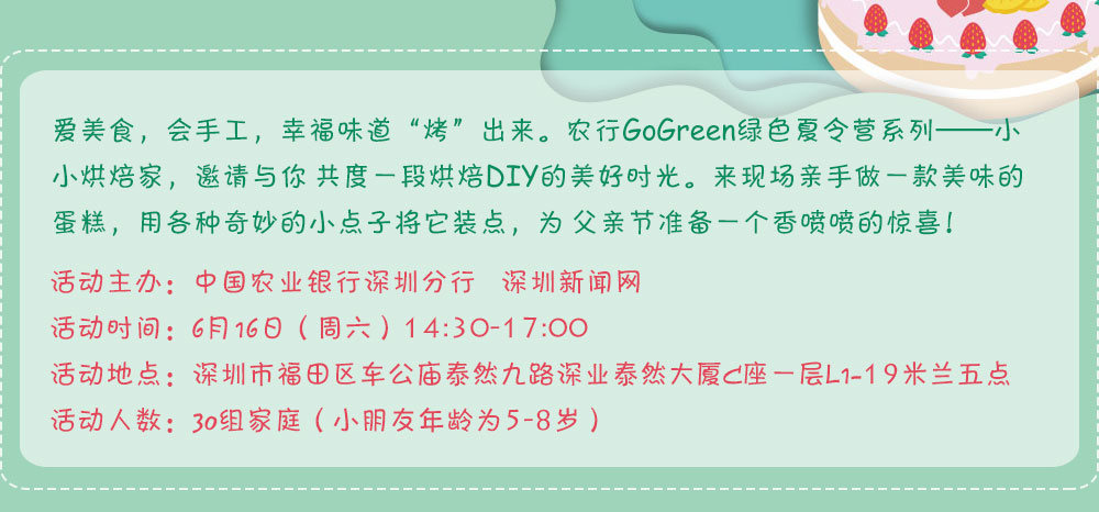 6月16日下午,中國(guó)農(nóng)業(yè)銀行深圳市分行聯(lián)合深圳新聞網(wǎng)開展了一場(chǎng)以親子體驗(yàn)為主題的Go Green綠色夏令營(yíng)之“小小烘焙家”活動(dòng),讓孩子們通過(guò)DIY蛋糕培養(yǎng)動(dòng)手能力和創(chuàng)造能力,為爸爸送上一份特別的父親節(jié)禮物。[詳細(xì)]