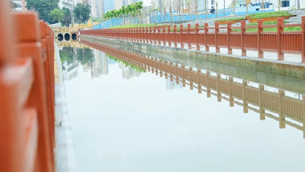 走在石圍涌岸邊,看到兩岸新修的朱紅色仿木欄桿與藍(lán)天、清水、綠草呼應(yīng),繪就了一幅自然、和諧、美麗的生態(tài)畫(huà)卷。